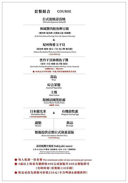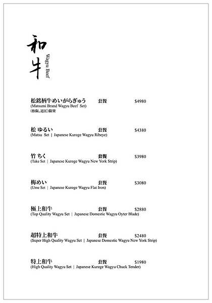 和牛套餐有松套餐 $4380、竹套餐 $3980、梅套餐 $3080、極上和牛套餐 $2880、超特上和牛套餐 $2480、特上和牛套餐 $1980 可以選擇,另有許多單點品項,偶爾也會有期間限定主餐可以點,像是螃蟹