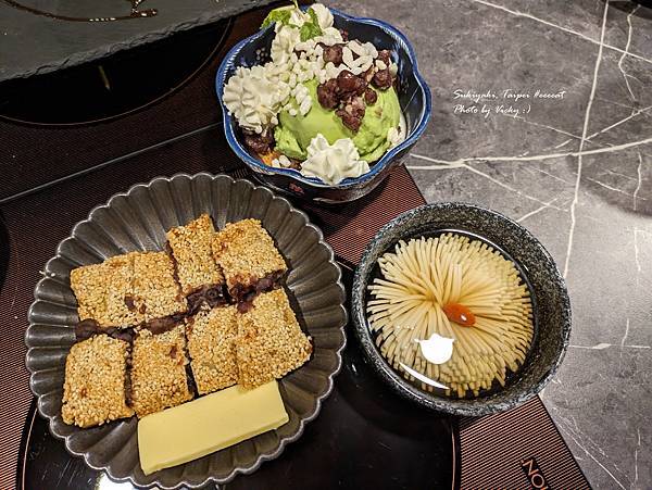 甜點我們選擇萬丹紅豆鍋餅 (每桌限點一份)、手切菊花豆腐和抹茶紅豆冰淇淋
