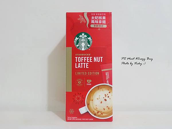 星巴克在冬季十一月、十二月都會推出太妃核果風味那堤,現在在家也能自己沖泡出美味的太妃核果拿鐵,紅色的包裝超級有聖誕節氣氛,我覺得送禮或自己喝都很棒,這款偏甜,可以搭配比較苦的甜點