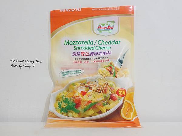 全聯架上有好幾款焗烤乳酪絲,我自己比較喜歡雙色這款,灑一些在土司、披薩上或是煮義大利麵用焗烤都不錯 ![]()